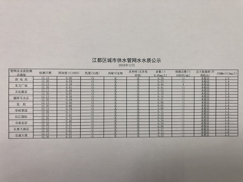2018年12月江都區(qū)城市供水管網(wǎng)水水質(zhì)公示