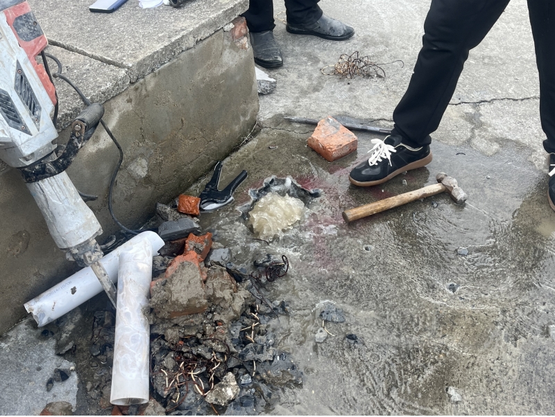 11月27日上午八點,安裝維修工郭亮師傅在南片區宜陵鎮大陳村維修水管。郭亮師傅先用風鎬破碎水泥路面,路面破開后發現漏水嚴重,由于大陳村所屬區域沒有控制小范圍的閥門,為了不造成大面積停水,不影響周邊居民的正常用水,在寒冷的冬季,郭亮師傅選擇涉水維修作業,經過兩個多小時的搶修,將該處漏點止住。