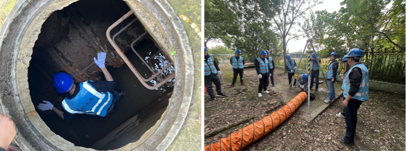隨著演練正式開始,演練人員在閥門井口發現有人違規操作,入井倒地。指揮組接到匯報,命令啟動有限空間應急搶修預案,并趕往現場。同時保障組攜帶鼓風機、安全繩、呼吸器等安全設施進入現場。站長到達閥門井后,使用空氣監測儀,并不間斷匯報檢測數據。搶修組進入現場后,穿戴防護用具。